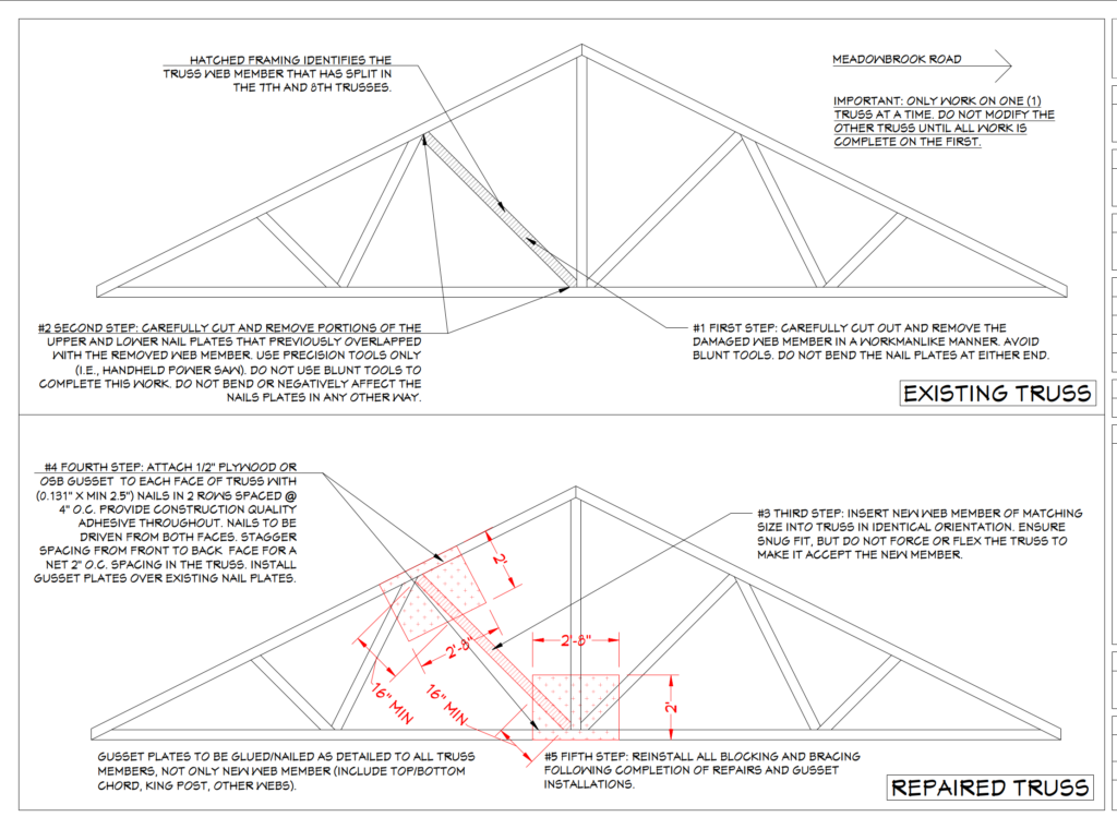 • Finalization: The repair is completed by reinstalling all necessary blocking and bracing to return the truss to its full design capacity.